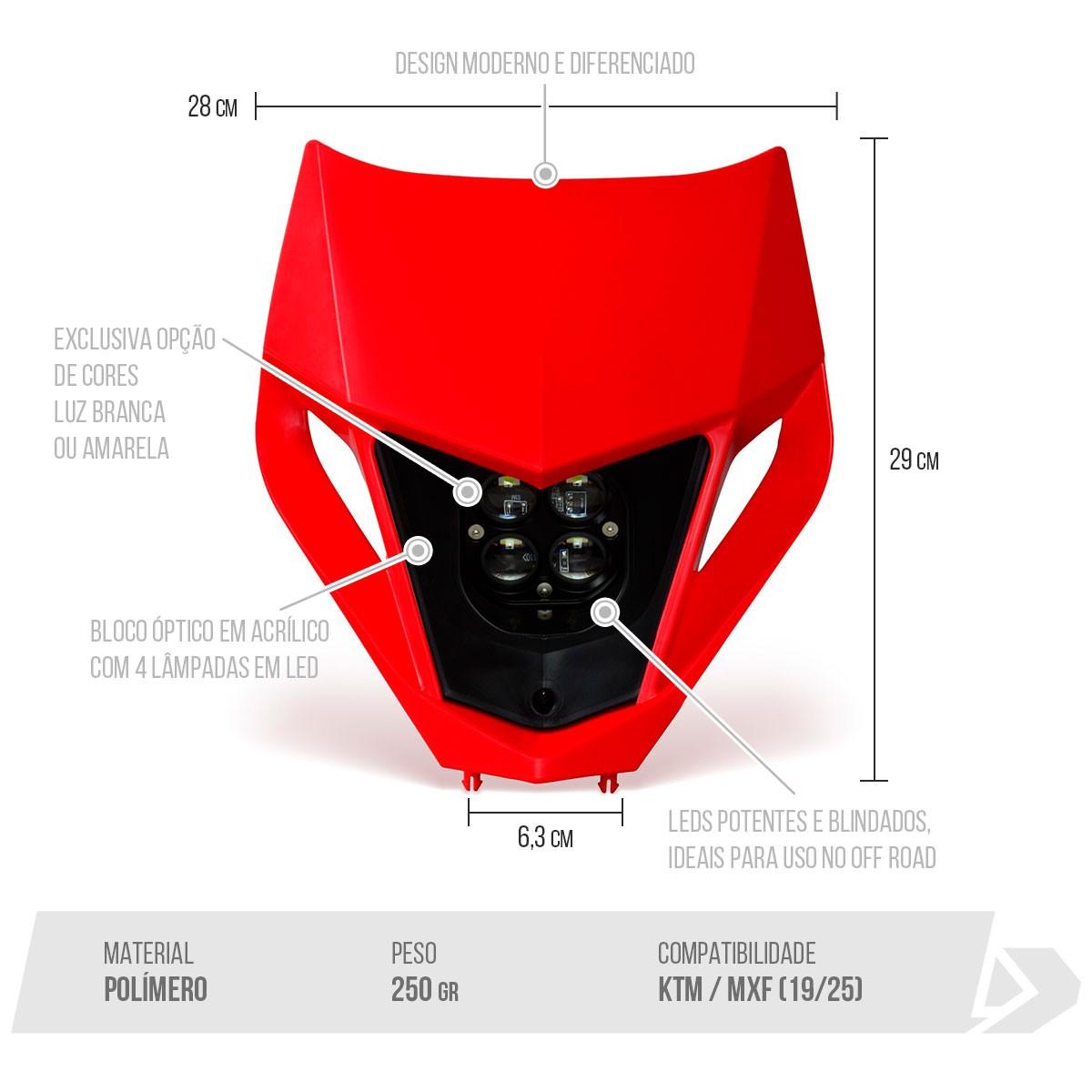Cores de luz disponíveis: branca (visibilidade geral) e amarela (ideal em neblina ou poeira)